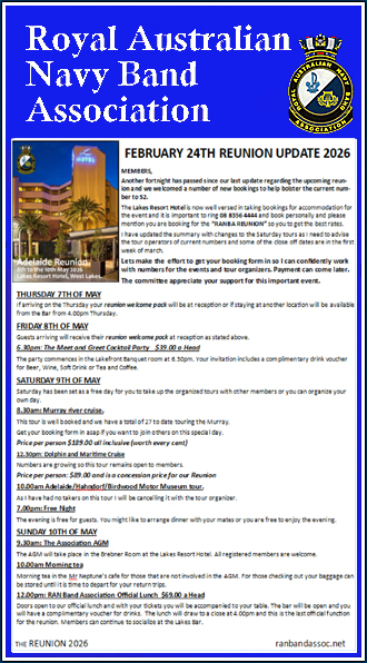 Please find attached the latest update regarding the reunion in Adelaide from the 8th of MAY to the 10th of MAY 2026.